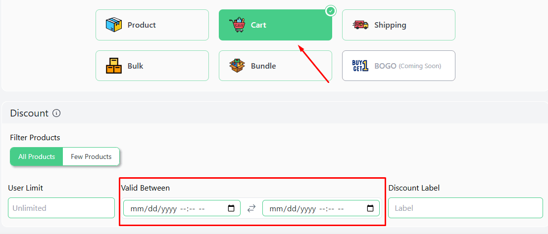 - Click on the Few Products option from the Discount section.