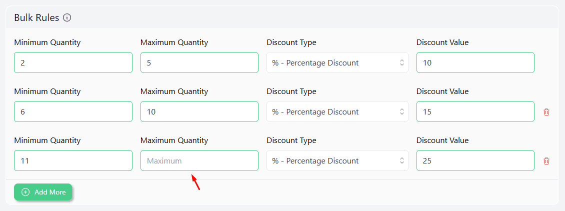 - Set the remaining values and leave the last Maximum Quantity field empty to indicate an unlimited quantity.