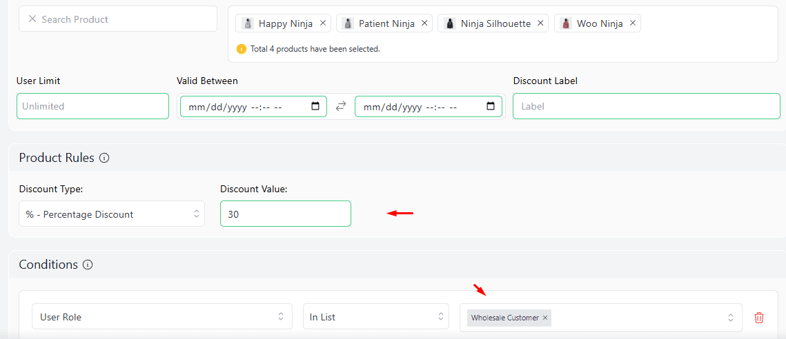 - Specify your products and set the percentage value.
