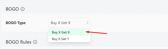 - Select the Buy X Get X option from the BOGO Type dropdown.