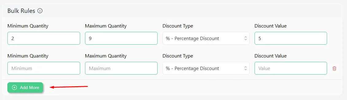 - Keep the last Maximum field empty to continue offering a 25% discount on any quantity over 20.