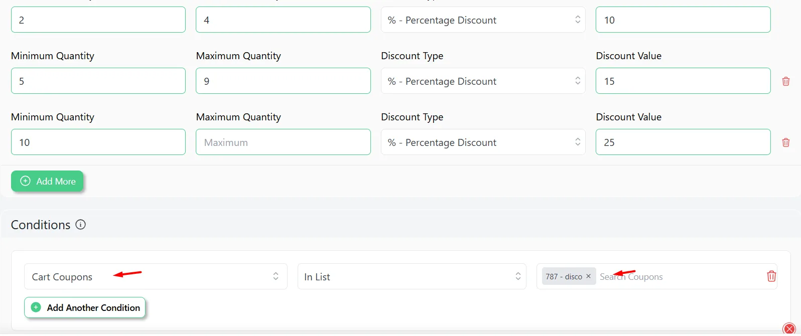 - Enter 2 in the Minimum and 4 in the Maximum Quantity box. Select and set the percentage value.